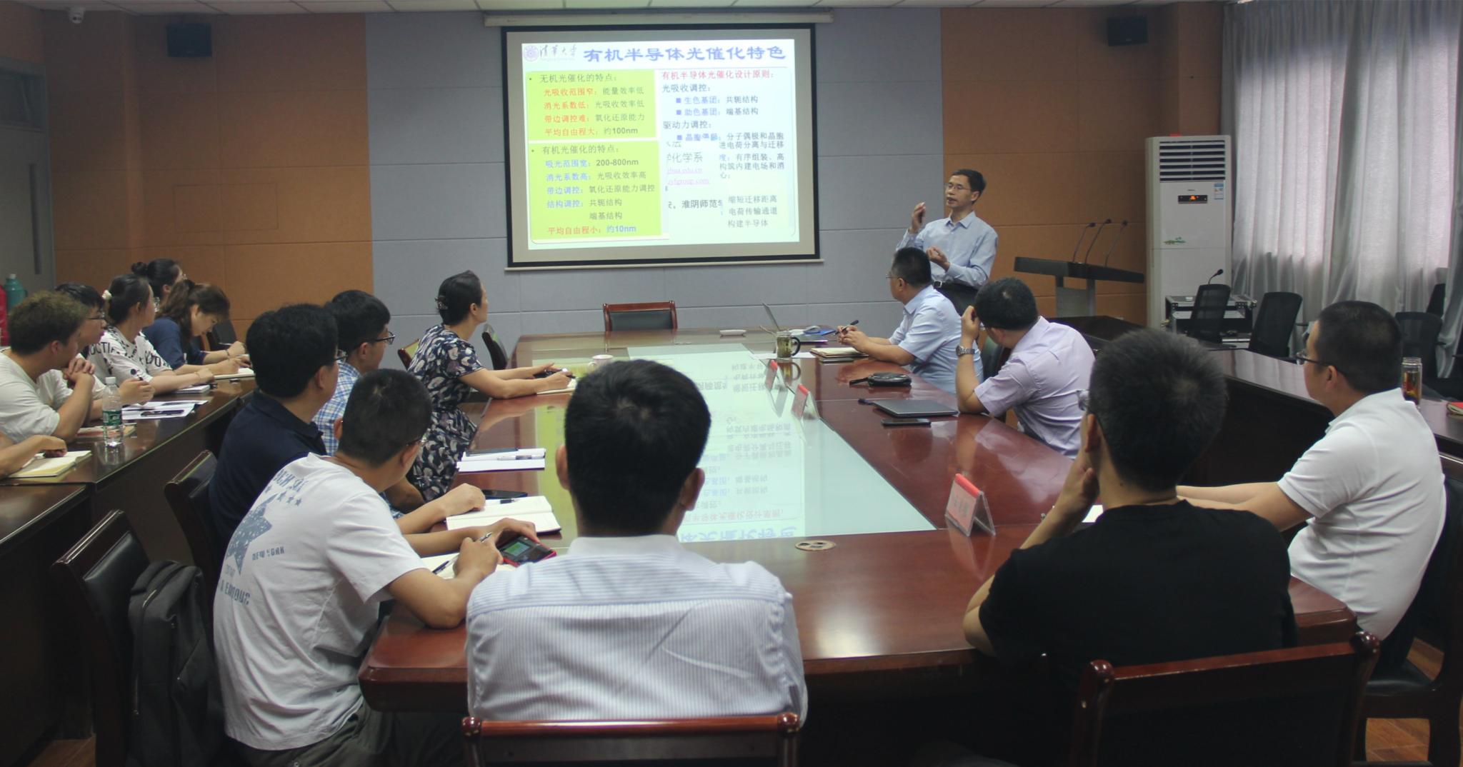 朱永法教授首先介绍并讨论了光催化面临的关键科学问题,然后系统介绍了其研究团队在有机半导体可见光催化产氢、产氧和CO2还原、有机-无机耦合全光谱光催化、有机超分子可见光催化快速、彻底、靶向消除实体肿瘤等方面的最新研究成果。重点介绍了有机光催化材料在环境净化、太阳能的利用等方面取得了重要研究进展,尤其在对于癌症的快速、低损伤、完全治疗方面有突出的应用,另外还介绍了共轭大π键相互作用调控价带位置和电荷分离,3D网络结构光催化剂及全有机超分子可见光催化剂在降解污染物方面的研究。报告内容丰富,论证严谨,既有前沿研究成果,又有从事科学研究思考和方法,给学院师生留下深刻印象。