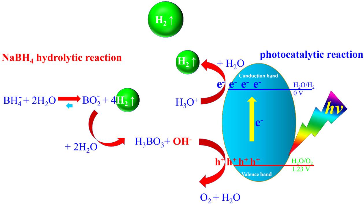 该研究发现传统的高效光催化制氢材料Zn2GeO4在受光照的情况下,其产生的光生空穴可有效抑制NaBH4水解制氢时产生的多余OH-,使水解平衡向产氢方向移动,因而形成“光-热”协同催化效应,可大幅度提高NaBH4水解制氢效率。
