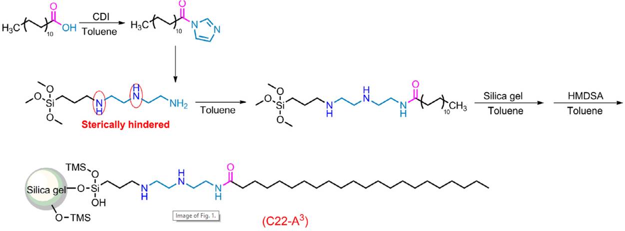 文章提出了一种基于线型长链烷基/多胺双亲选择体的高效液相色谱固定相的合成方法。该选择体经化学键合固载至硅胶后形成均匀的二十二烷基/三胺串联体固定相。该固定相相较于常规C18固定相和酰胺嵌入C18固定相对几何异构体的形状选择性更强,且对碱性分析物的硅羟基活性更低,极大地改善了碱性化合物的分离。由于多个氨基的存在,该新型填料可以在多种色谱模式下工作,如亲水性相互作用和离子交换模式。该固定相可以优异地分离不同类别的分析物,如多环芳烃、类黄酮、三环抗抑郁药、钙通道阻滞剂、芳香酸、无机阴离子、核苷和雌激素,显示出在多用途LC应用方面的积极适用性,具有巨大的混合色谱分离潜力。