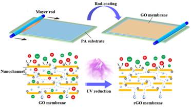 研究人员开发了许多方法制备GO膜,如真空抽滤、压力辅助过滤、滴涂、浸涂、旋涂、喷涂和自组装。遗憾的是,这些方法受到设备尺寸的限制,无法实现GO膜的大规模生产。刮刀涂覆技术是生产大面积GO膜的一种可能方法,因为它允许通过剪切流动均匀涂覆。然而,制备高粘度GO油墨(脱水或交联)需要额外的复杂步骤。因此,通过可扩展的连续方法直接制备均匀GO膜仍是一个未解决的问题。棒涂技术是一种快速、连续、可控、大规模的液膜加工方法。该技术基于Mayer棒,即用不同直径的不锈钢丝包裹的不锈钢棒,这种结构使其能够将超低浓度的溶液涂覆成均匀的薄膜。而且,制备的薄膜的尺寸仅受Mayer棒长度和涂布机尺寸的限制,因此,可以很容易地制备大面积薄膜。此外,为了提高分离性能,广泛采用的方法是控制GO膜的层间距。为实现这一目标,人们开发了许多还原方法,如热还原、化学还原和光还原。通常,热还原需要高温,而化学还原需要有毒且昂贵的化学试剂(如水合肼)或较长的反应时间。这些缺点阻碍了它们的实际应用。光还原是一种环境友好的GO还原方法,因为它不需要高温或有毒化学品。光还原的光源可以是紫外线(UV)、闪光或激光,甚至是阳光。然而,大部分光还原过程发生在溶液中,这大大削弱了GO在溶剂中的分散性,进而影响了GO膜的均匀性。因此,开发一种快速、固态、大面积、低成本的GO膜还原策略以满足工业生产的需要是非常有必要的。