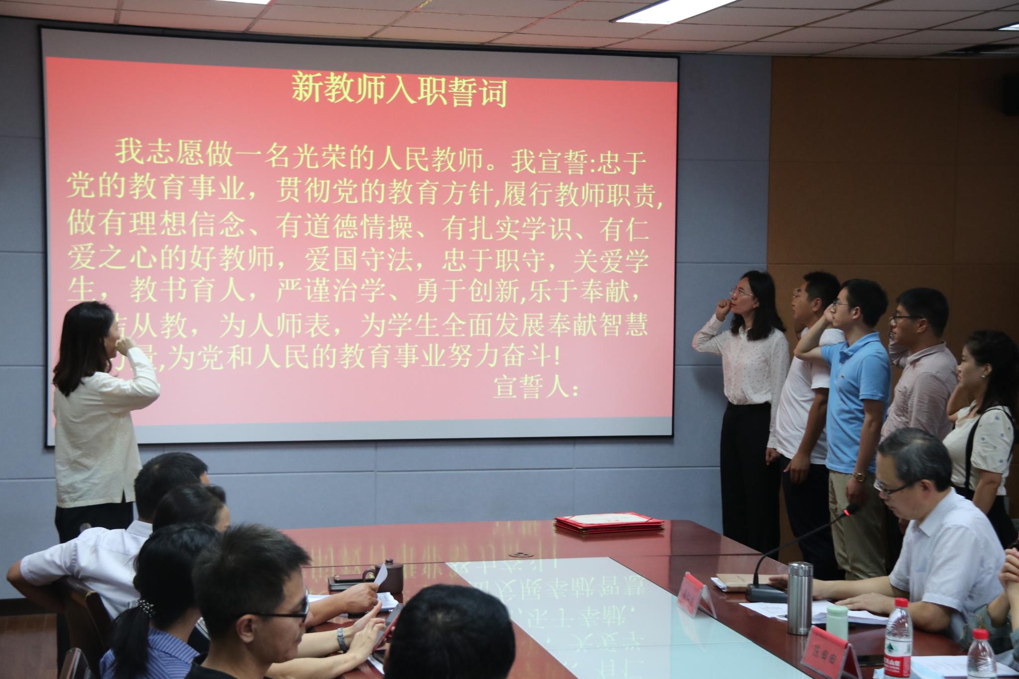 在宋洁老师的带领下,新入职的五位青年教师进行了入职宣誓:“我志愿做一名光荣的人民教师。我宣誓:忠于党的教育事业,贯彻党的教育方针,履行教师职责,做有理想信念、有道德情操、有扎实学识、有仁爱之心的好老师……”。