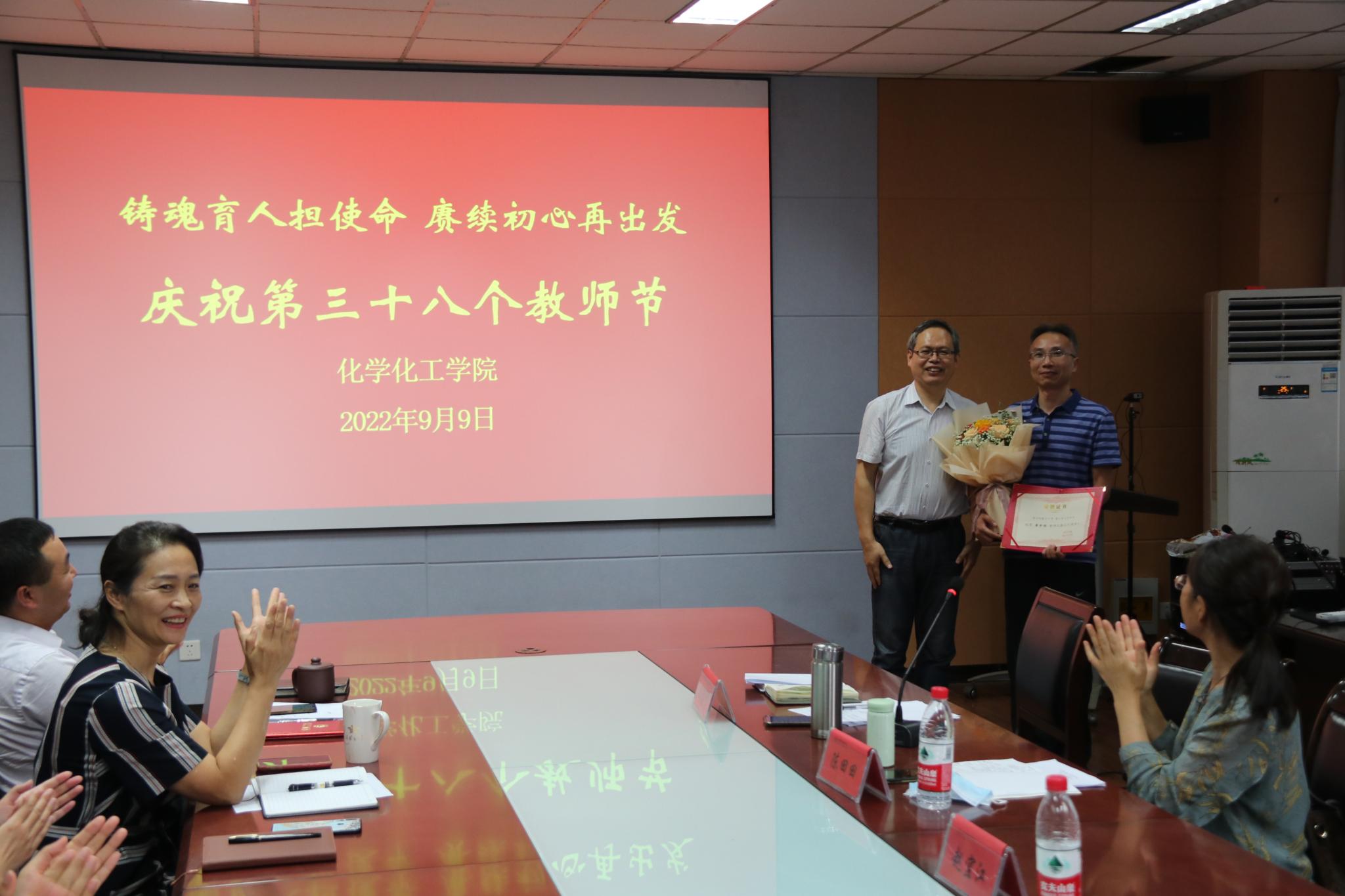赵宜江校长为五位青年教师的指导老师颁发聘书,青年教师为导师献花;骆仁林书记向单步顺老师颁发从教三十周年荣誉证书;周守勇院长为化院青年教师教学基本功大赛获奖选手颁奖。