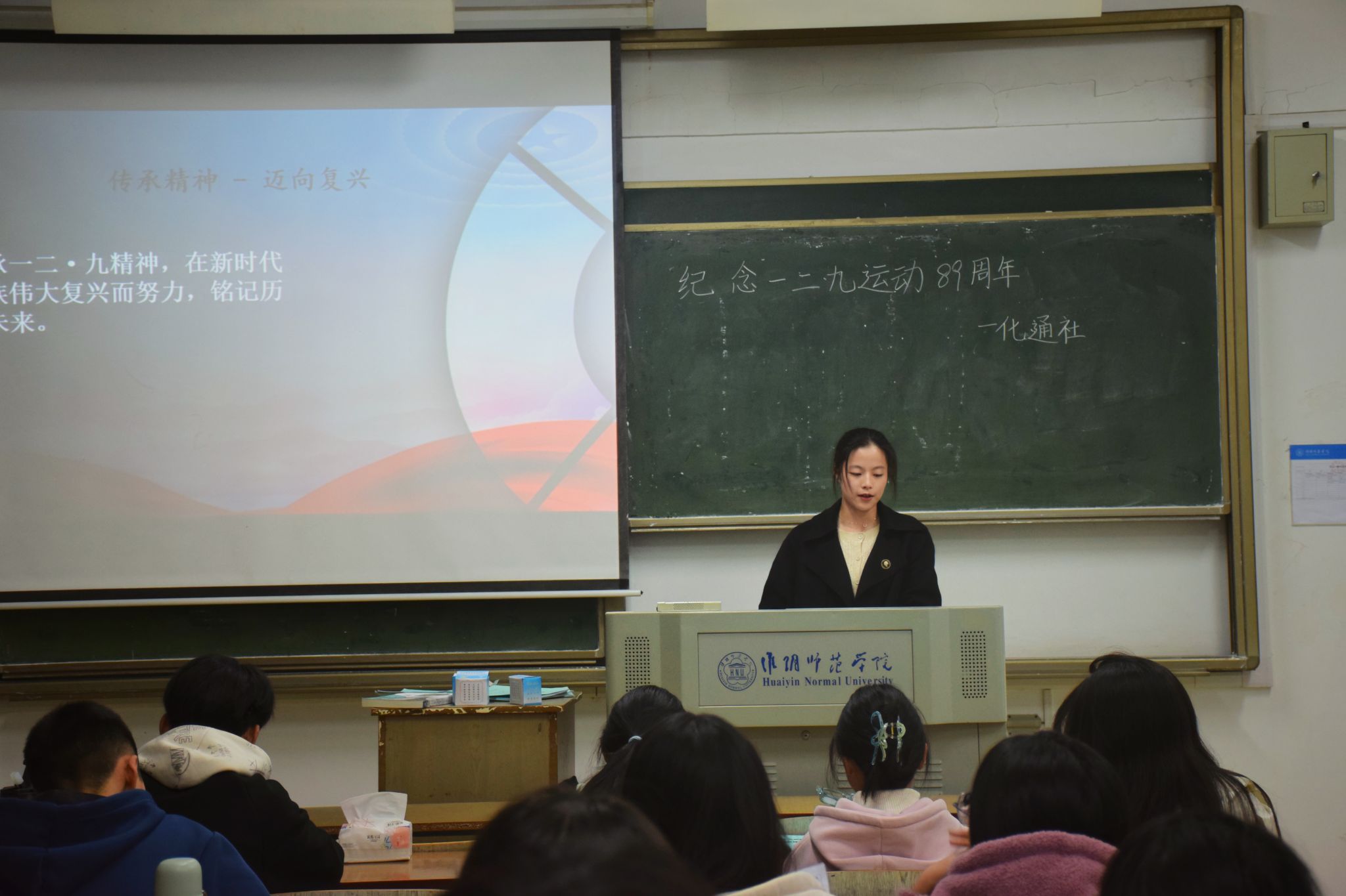 活动伊始,主持人刘梦冉和黄玺蓉化身历史讲者,引领同学们们穿越回“一二·九”那段激情燃烧的岁月。他们用饱含深情的语调,将那段为争取国家独立、民族解放而英勇斗争的历史娓娓道来,让同学们仿佛亲眼目睹了先辈们的英勇身姿,感受到了那份炽热的爱国情怀。随后,主持人将话题转向当代,鼓励青年一代要在新时代的征程中,继承和发扬“一二·九”精神,勇于担当,敢于创新,为国家的繁荣富强贡献自己的力量。同学们被深深触动,心中涌动着对祖国的无限热爱和对未来的美好憧憬。最后,主持人以激昂的语调,号召同学们将“一二·九”精神内化于心、外化于行,铭记历史,不忘初心,为实现中华民族伟大复兴的中国梦而努力奋斗。现场掌声雷动。