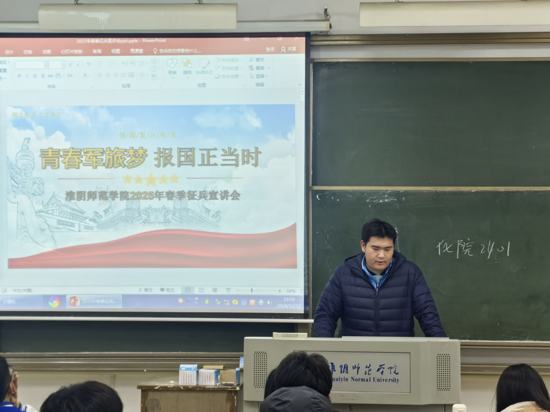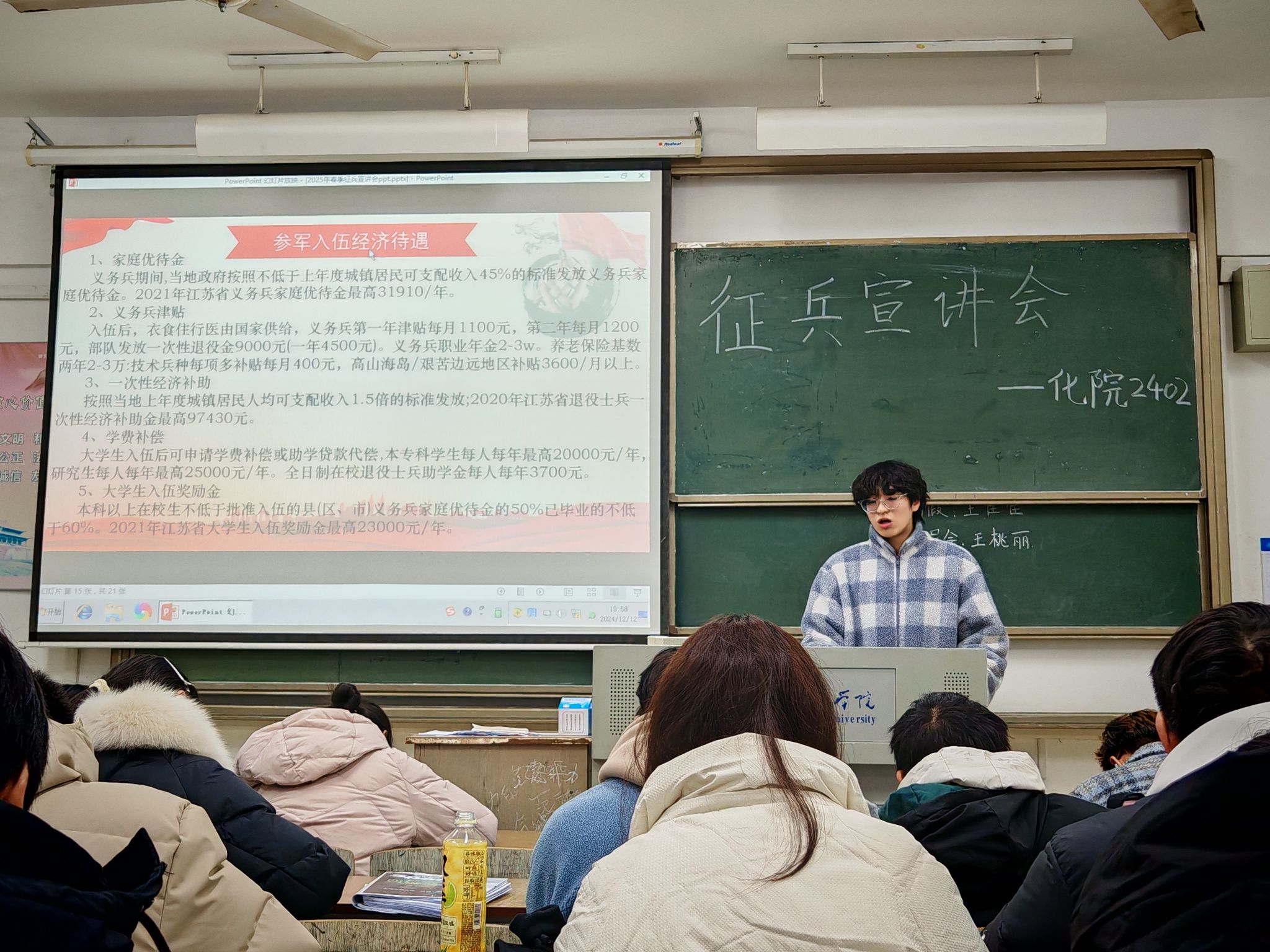为积极响应国家征兵号召,全面普及征兵信息与政策,提升适龄大学生对应征入伍的认知度与积极性,12月12日晚,化院各班级在晚自习教室开展2025年征兵宣传主题班会。此次班会旨在深入宣讲征兵政策,展现军队卓越风采,激励同学们踊跃报名参军,为国家的繁荣昌盛与国防事业贡献青春力量。