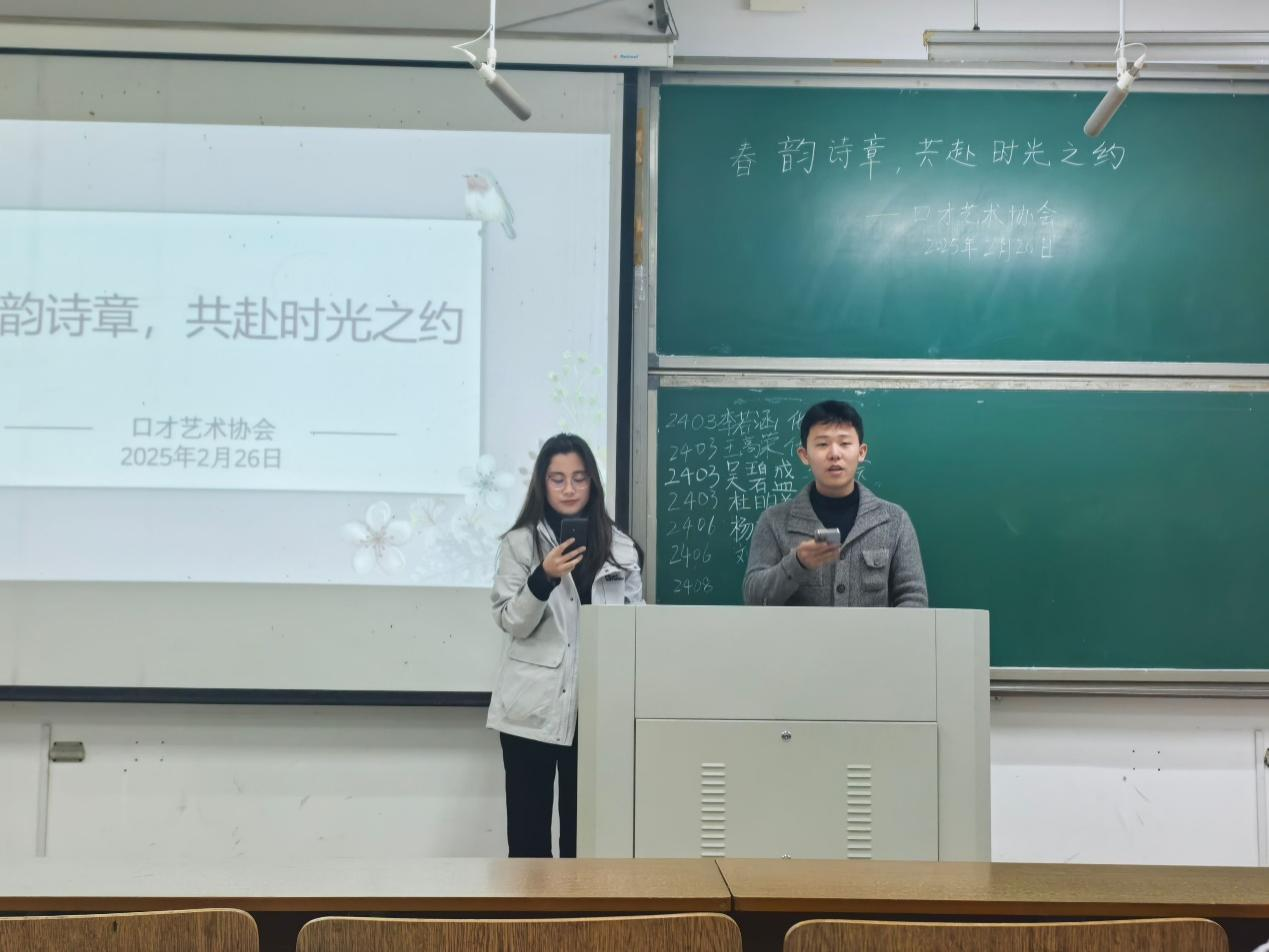 77779193永利官网口才艺术协会于2月26日在弘文3-101教室举办“春韵之音”主题诗朗诵比赛。作为学院春季文化品牌线下活动,本次赛事吸引众多选手参赛,通过诗韵与春光的交织,为师生呈现了一场别开生面的文化盛宴。