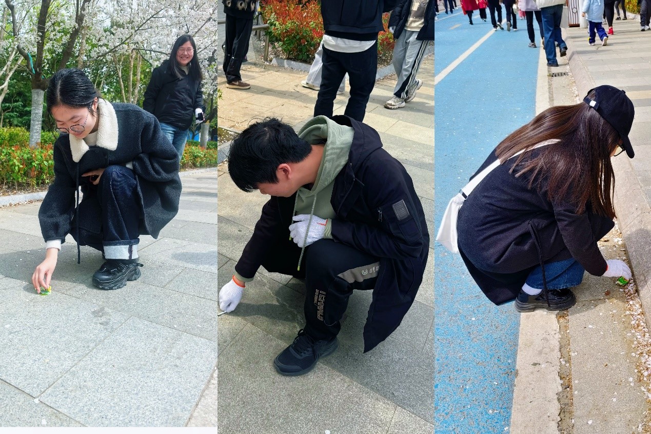 春日的樱花园,樱花盛开,如云似霞,美不胜收。然而,在这美景之下,也存在着一些生态隐患。同学们一到樱花园,便迅速行动起来,分成多个小组,穿梭在樱花树下,在园内仔细清理捡拾游客遗留的垃圾,再分类投放到指定的垃圾桶中。