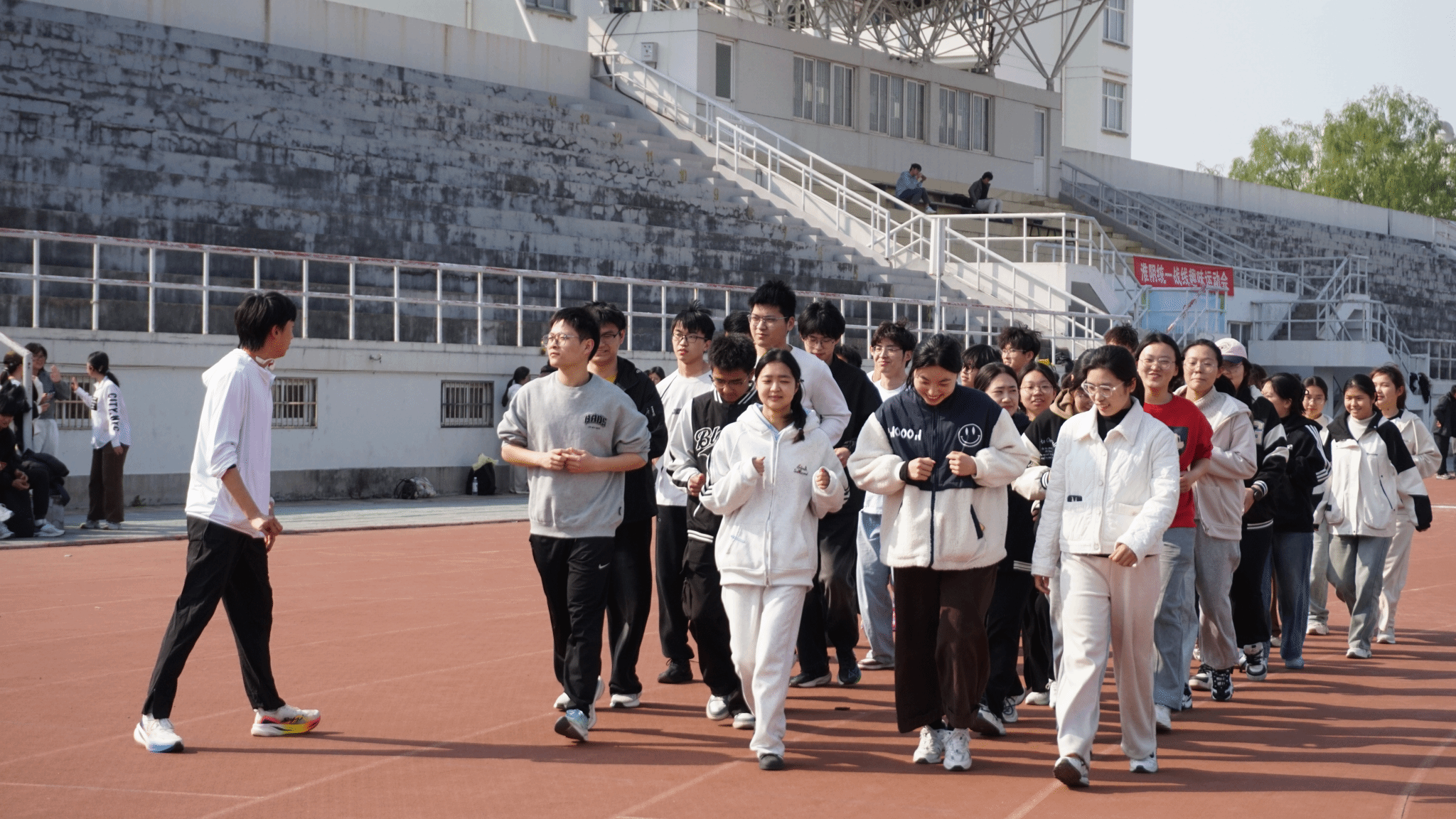 舒展身心,活力开篇。活动伊始,主持人通过抽签将同学们分为8个小组,并以慢跑热身拉开序幕。同学们迈着整齐的步伐,绕操场慢跑,逐渐舒展身心,现场氛围在欢声笑语中升温。