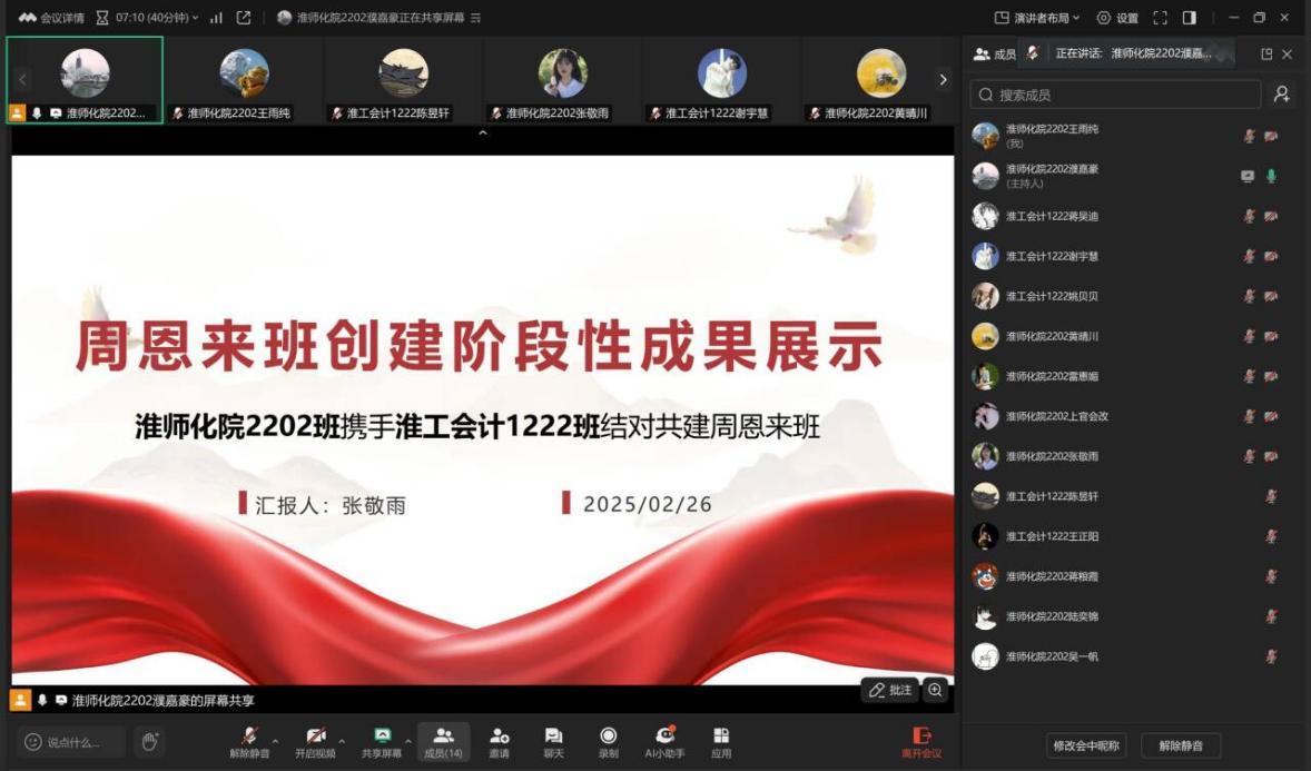 2月26日,77779193永利官网2202班与淮阴工学院会计1222班开展线上交流活动。两班围绕“周恩来班创建阶段性成果展示”,分享经验,共同探寻传承伟人精神的新路径。活动由2202班班长濮嘉豪主持,主要班级干部和部分普通同学参与。