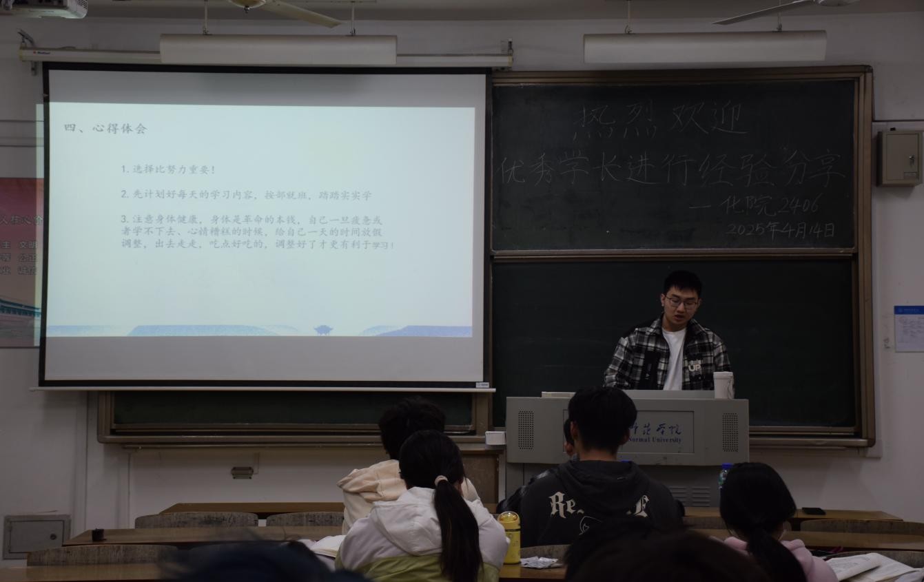 活动伊始,李伟老师向同学们分别介绍了三位优秀学长,他们分别是泰州市泰兴市高中化学老师蒋荣贵、笔面双第一上岸苏州高新区初中化学编制的潘智阳、吉林大学准研究生徐阳。