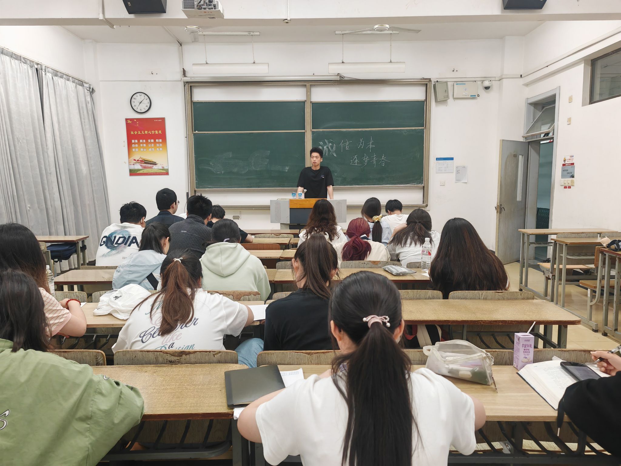5月14日,同学们在崇文楼1-103教室围坐一堂。班长首先发言,强调了诚信在个人成长与班级发展中的重要性。随后,学习委员分享了自身在学习中践行诚信的经验,从认真对待每一次作业到考试严格自律,日常细节中彰显诚信品质。同学们也结合自身经历展开讨论,讲述小组合作中信守承诺、按时完成任务等事例,在交流中深化对诚信的感悟。