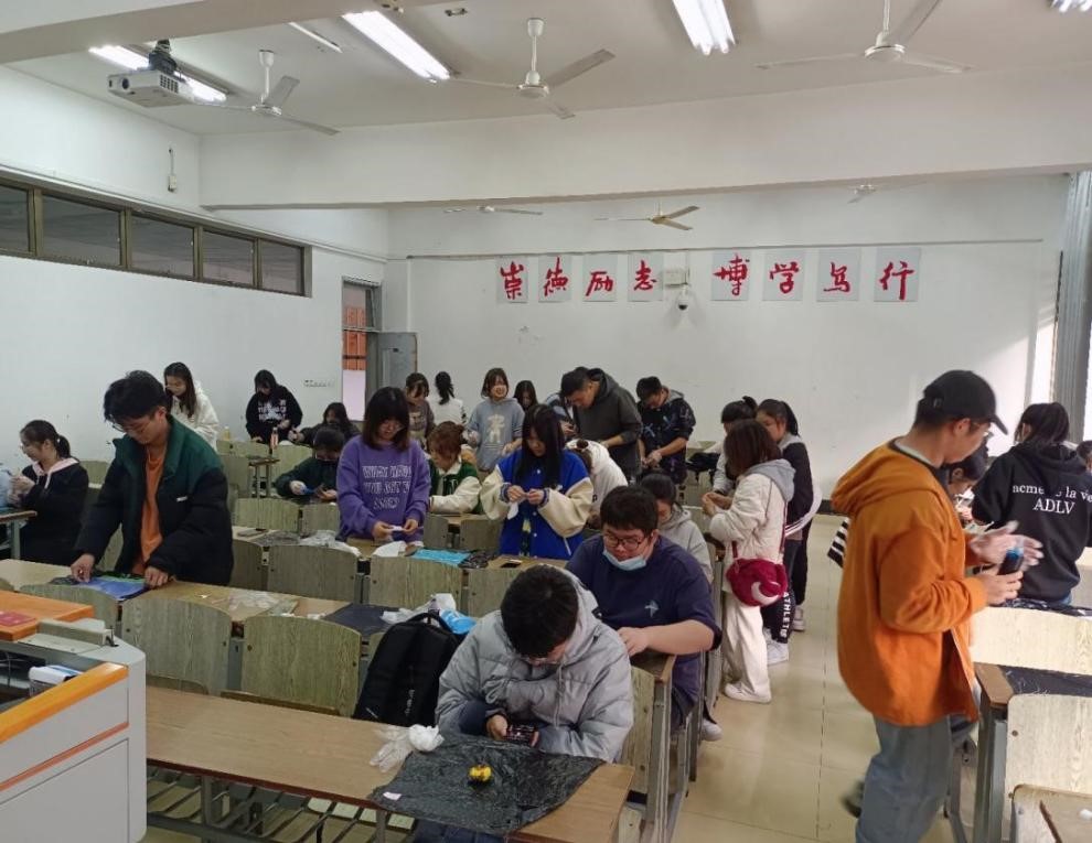 11月27日,海棠花学社在崇文楼3-101组织并开展了“以恩来精神,筑梦成长”主题活动。活动面对淮阴师范学院全体同学,活动旨在弘扬周恩来总理的艺术与创新精神,让同学们认识扎染这项非遗民间传统艺术,进一步了解并掌握有关扎染的基本知识与工艺。活动开始前,海棠花学社各负责人与干事提前布置了活动场景并为活动进行准备。