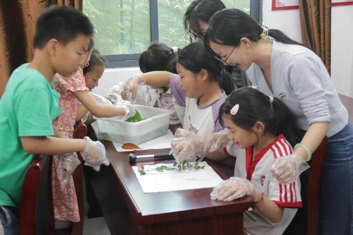 实验小组在桂塘小学开展了生动有趣的科普活动。团队成员张宇向同学们介绍了植物拓染的过程与其中的化学原理,引发了孩子们对拓染的浓厚兴趣。在实验小组的帮助和引导下,小朋友们顺利完成了属于他们自己的拓染作品,锻炼了动手能力,也提高了科学素养。