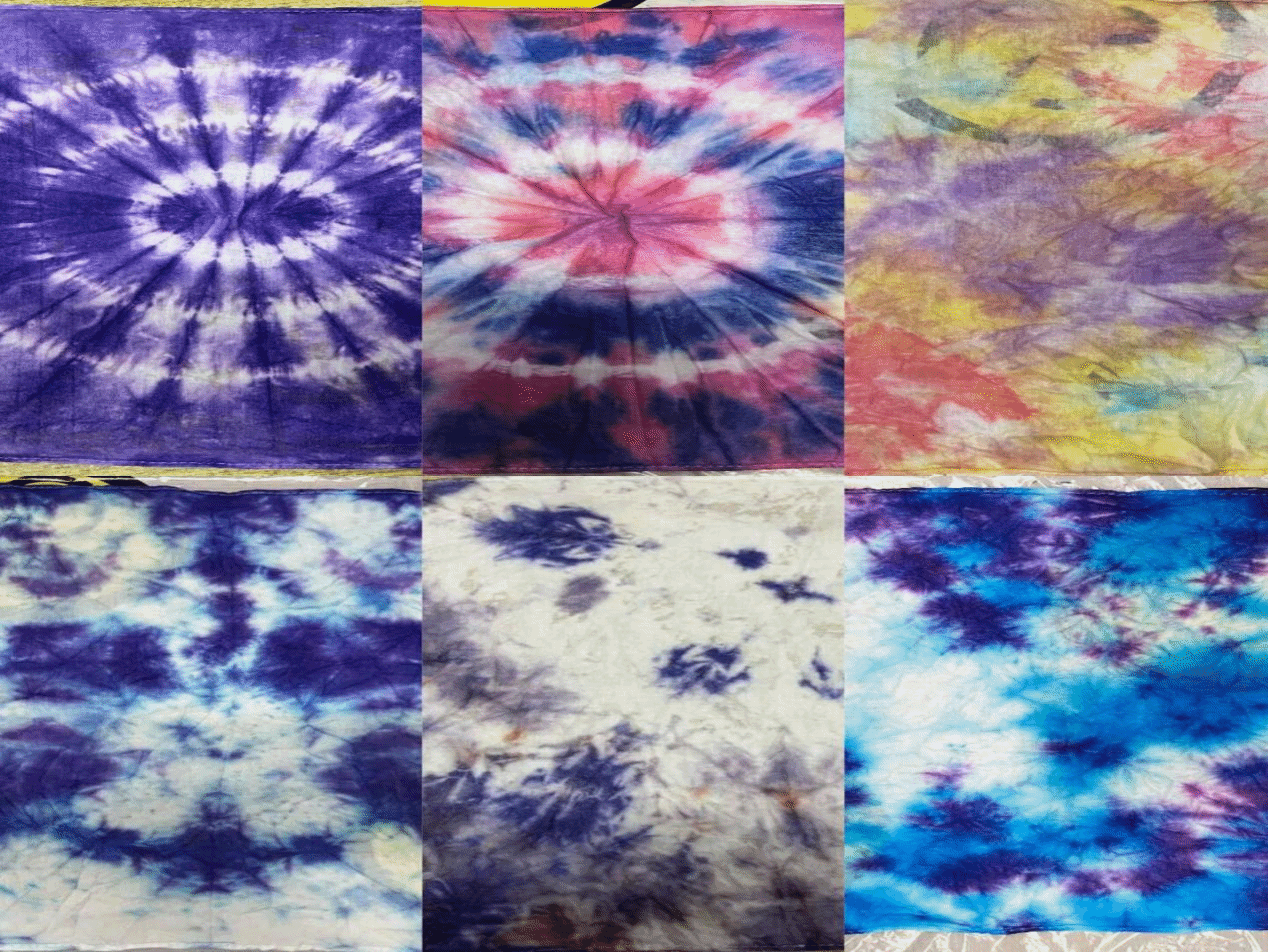 首先由负责人提前布置好了活动现场,同学们相继入座后,主持人先向大家介绍了扎染的背景与意义,随后同学们便纷纷开始动手创作。色彩跃然于布料上,有“向阳草木青,明媚春光暖”的盎然春色,有“星垂平野阔,江入大荒流”的磅礴川河,亦有“暗暗淡淡紫,融融冶冶黄”的精致花朵。虽是色彩无心的叠加,却也呈现出了丰富的层次感和立体感。同学们完成作品后,便交由评委们评分,每位同学的作品都各有秋色,给人以柔和、舒适的感觉。