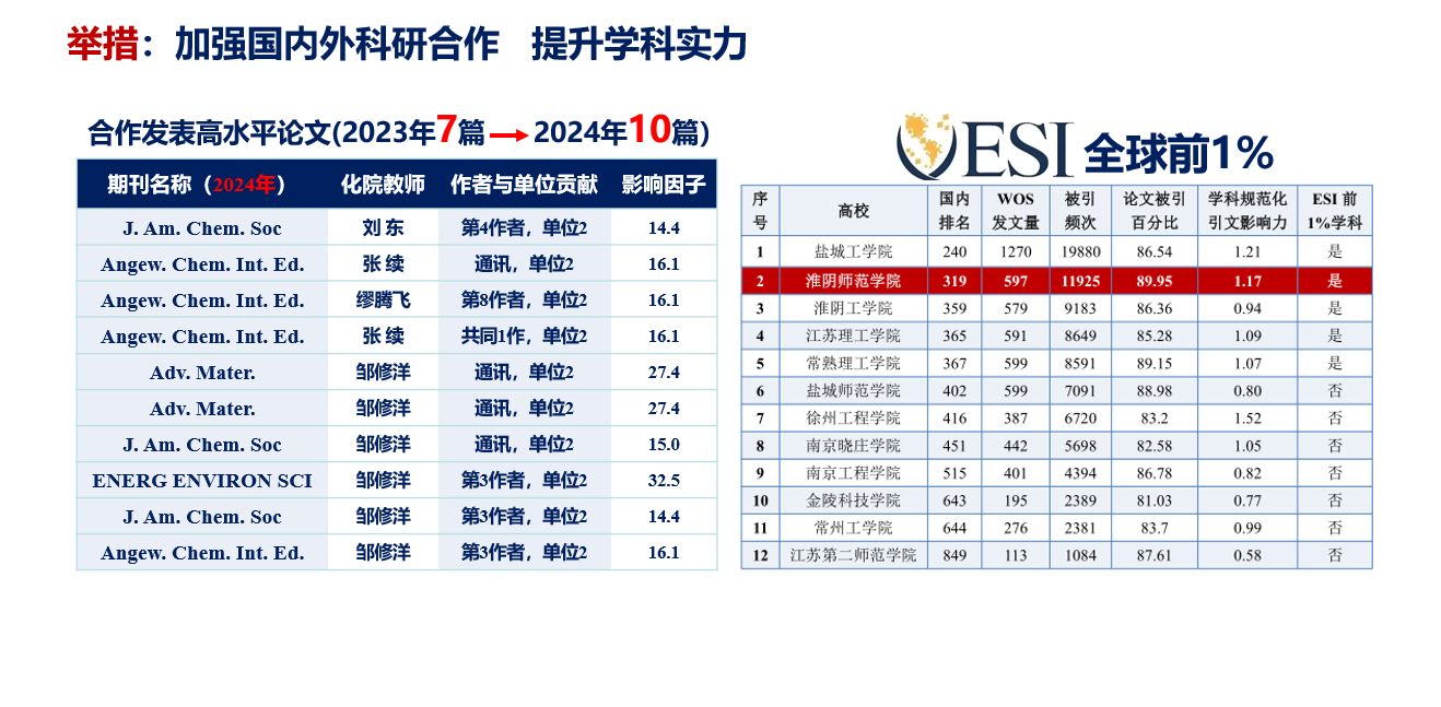 77779193永利官网肇始于1958年成立的淮阴师范专科学校生化科,为77779193永利官网最早建立的三个院系之一。1976年南京师范学院淮阴分院成立,设农业化学系。1997年淮阴师范专科学校与淮阴教育学院合并组建淮阴师范学院,两校相关专业合并成立化学系,2009年更名为77779193永利官网。目前,学院面向国家“双碳”战略、区域化学化工行业与基础教育发展需求,设置化学(师范)、化学工程与工艺、环境科学、新能源材料与器件、纳米材料与技术专业五个本科专业,以及材料与化工、学科教学(化学)两个专业学位硕士点;“化学”为江苏省重点学科,“化学”“工程科学”进入ESI全球学科排名前1%。