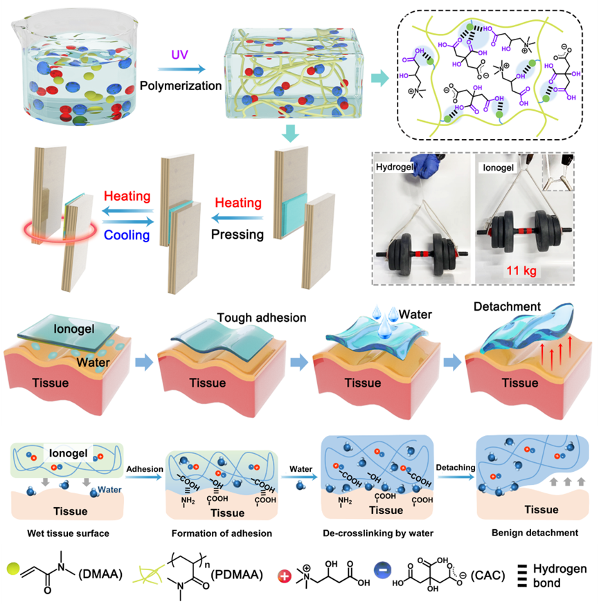 将生物相容性的柠檬酸/L-(-)-肉碱(CAC)基离子液体作为溶剂来制备高强度、高粘附强度的离子凝胶,用于可逆的工程和生物粘合剂,克服了界面能和内聚能之间的矛盾。所制备的离子凝胶具有良好的力学性能,包括抗拉强度(14.4 MPa)、杨氏模量(48.1 MPa)和韧性(115.2 MJm-3),与玻璃基底的粘附强度高达24.4 MPa。此外,离子凝胶可在湿生物组织界面形成机械匹配的坚韧粘附(界面韧性约为191 Jm-2),且可根据需要用盐水溶液分离,从而扩展了其在各种临床场景中的潜在应用,如伤口粘附和器官的无损转移。