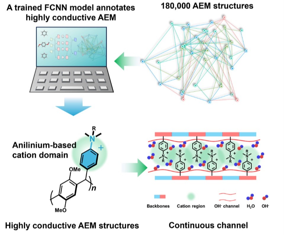 氢能作为清洁无污染的新能源,成为当下一种重要的储能介质。氢能的制备与利用很大程度上依赖于燃料电池和电解水装置。阴离子交换膜与商业化的质子交换膜( PEM )相比,在碱性条件下具有更快的氧还原性,可以利用非铂族贵金属催化剂(如钴、镍和银)等优势。目前AEMs能源器件的商业化应用由于AEMs的氢氧根离子电导率低和碱稳定性差而受到阻碍。因此开发高电导率,高碱稳定性的AEMs是当下的研究热点。结合当下热点人工智能,将人工智能中的机器学习应用到新材料的设计中来,给新材料的设计提供了一个新思路。