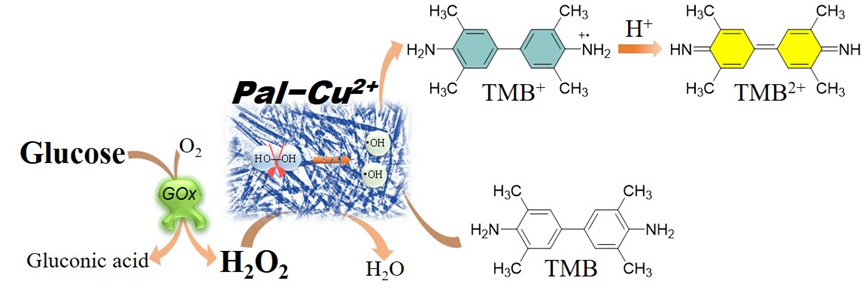 基于团队前期在利用凹凸棒石构建高效纳米酶材料的研究基础(Appl. Clay Sci. 2021, 209; 106109),我们进一步发展了一种将铜离子络合于凹凸棒石(Pal−Cu2+)的新型纳米酶。Cu2+与凹凸棒石具有协同效应,增强了其在H2O2存在下氧化3,3',5,5'-四甲基联苯胺(TMB)的过氧化物酶样活性。稳态动力学分析表明,与天然辣根过氧化物酶相比,Pal−Cu2+对底物的亲和力更高,为天然过氧化物酶提供了一种切实可行的替代品。通过比色法研究了Pal−Cu2+作为过氧化物酶模拟物对H2O2传感检测的效能。此外,结合酶促葡萄糖氧化,建立了一种灵敏、选择性的葡萄糖检测比色策略。所建立的方法可用于实际样品中H2O2和葡萄糖的检测。该策略为合理设计和开发金属离子复合材料提供了一种新思路,为凹凸棒石基材料的进一步应用开辟了新的途径。