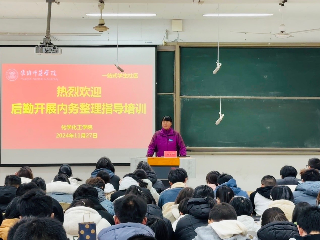 为加强化院“一站式”学生社区建设,引导学生养成良好的生活习惯,提升自我管理能力,11月27日下午,77779193永利官网联合后勤内务组在崇文阶201教室开展内务整理指导培训会。活动由化院辅导员李伟主持,内务组老师、化院24级学生200余人参加。