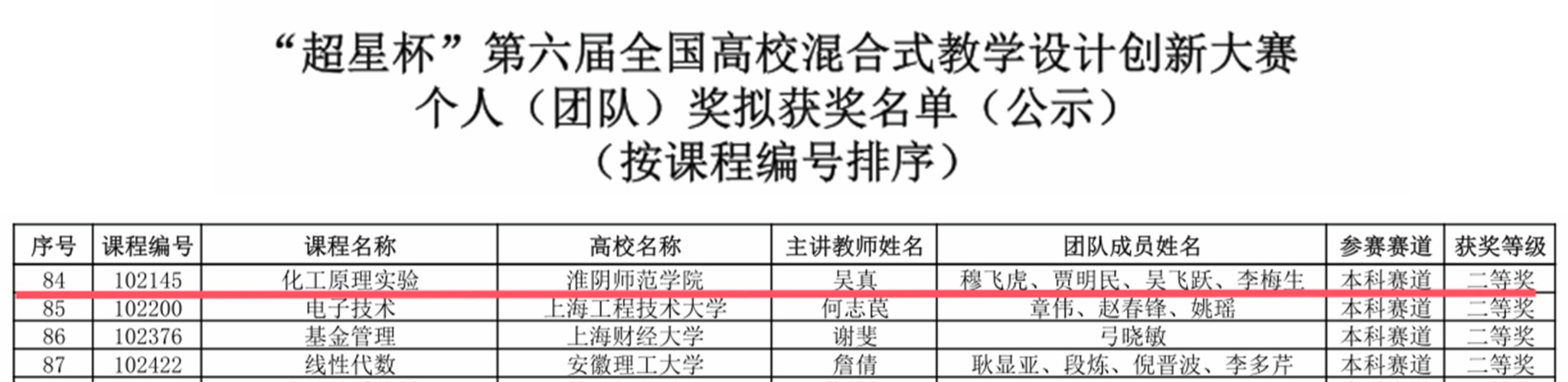 近日,第六届全国高校混合式教学设计创新大赛在西安电子科技大学落下帷幕。经校赛选拔推荐、网络评审、全国现场决赛、赛事委员会审议通过等多个环节,化院吴真老师团队(成员:穆飞虎、贾明民、吴飞跃、李梅生)的《化工原理实验》荣获二等奖,实现了学校在该项赛事的新突破。