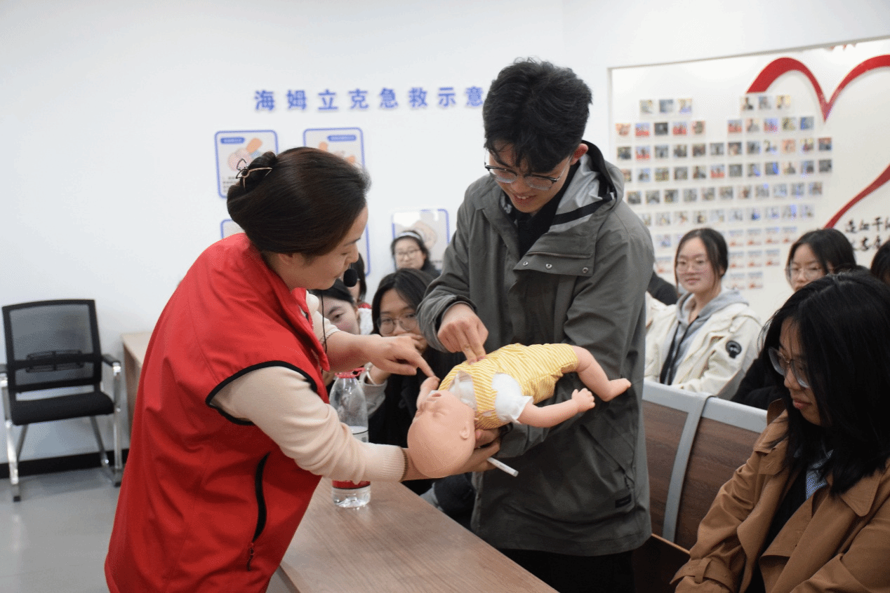 培训首设红十字运动专题讲堂,系统解析国际红十字发展脉络。理论课程聚焦三大急救模块:淮安市红十字救护师资曹玲玲通过多媒体演示与高仿真模拟人实操,详解海姆立克急救法的差异化应用,规范演示心肺复苏标准流程,包括环境评估、胸外按压及人工呼吸技术要点,同步完成AED设备全流程操作教学。
