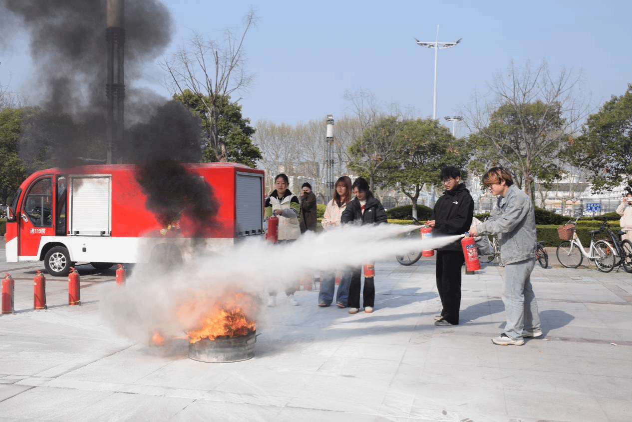 掌握技能,夯实安全根基。讲座结束后,王广慧老师带领40余名学生代表前往生化楼广场开展灭火器使用实操教学。教学现场,王广慧老师率先垂范,以标准且娴熟的动作演示了干粉灭火器的具体操作流程,从拔掉保险销,到握住喷管、按下压把,每一个步骤都精准到位、清晰明了。随后,在王老师的悉心指导下,学生们依次上前进行实际操作演练,亲身体验灭火器的使用方法,力求将所学技能内化于心、外化于行。