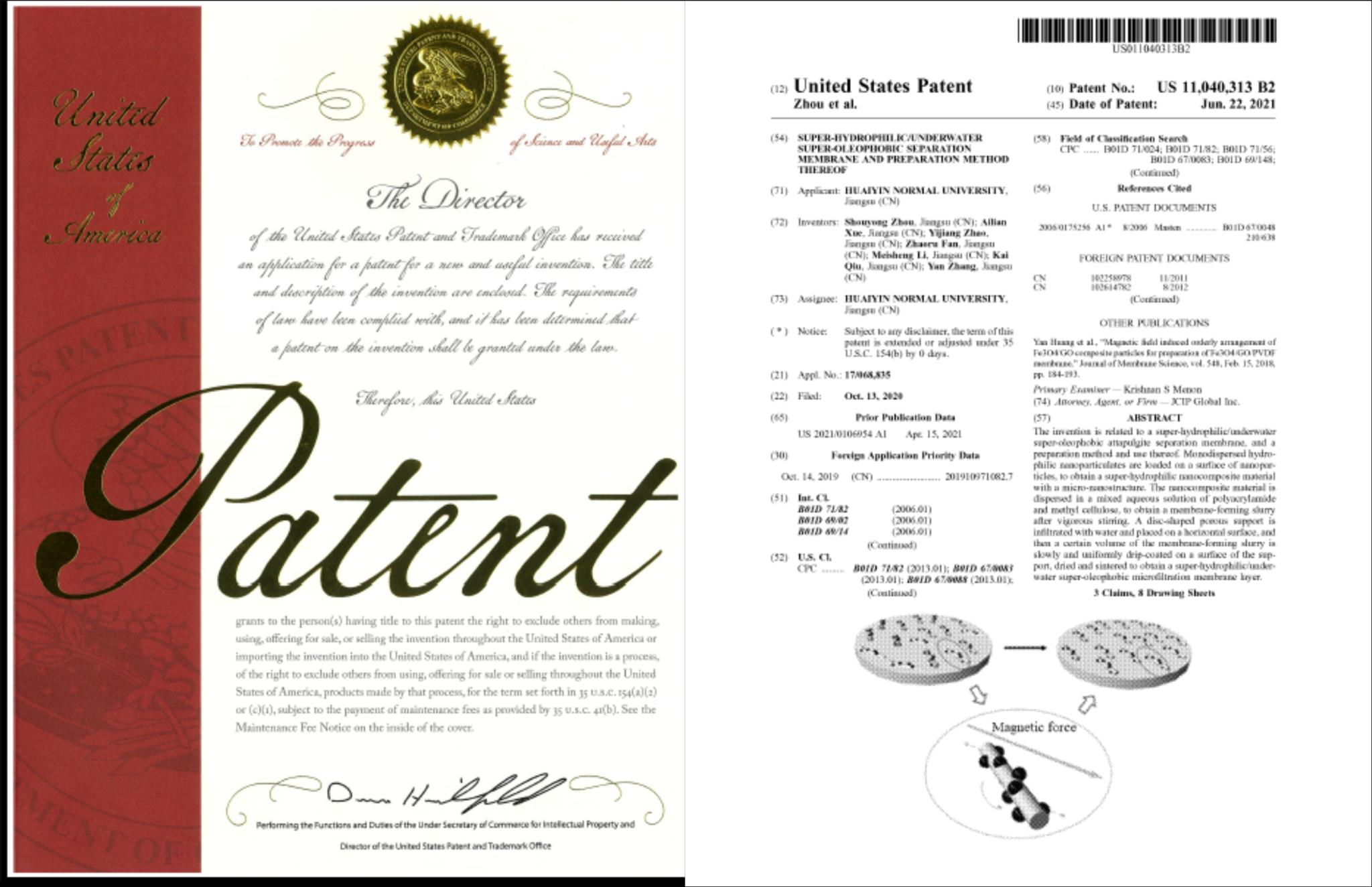 近日,先进膜材料与过程团队申请的美国发明专利 Super-hydrophilic/underwater super-oleophobic separation membrane and preparation method thereof(US11040313B2)获美国专利与商标局授权,周守勇、薛爱莲、赵宜江、范兆如、李梅生、邱凯、张艳为该专利的发明人。