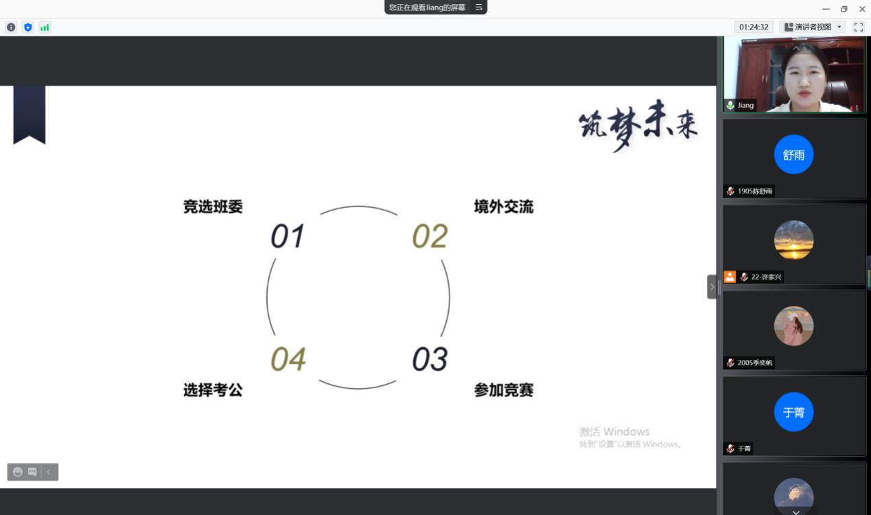 2017级优秀校友,蒋俊慧重点介绍本科阶段的竞赛经历以及前往悉尼大学交流学习的经验,建议新生积极参加各项化工竞赛,提高综合能力,就英语学习方面,强调英语口语的重要性。