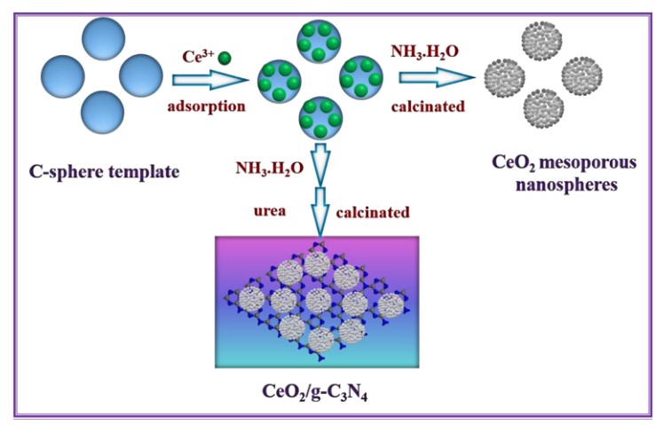 通过热处理去除碳球模板成功制备出两种新型CeO2/g-C3N4、Au/g-C3N4/CeO2异质结光催化剂。该类光催化剂通过异质结结构可有效的抑制光生载流子的复合;同时由于其表面存在金纳米颗粒,可产生表面等离子体共振效应,从而可有效促进光催化剂对可见光的吸收。