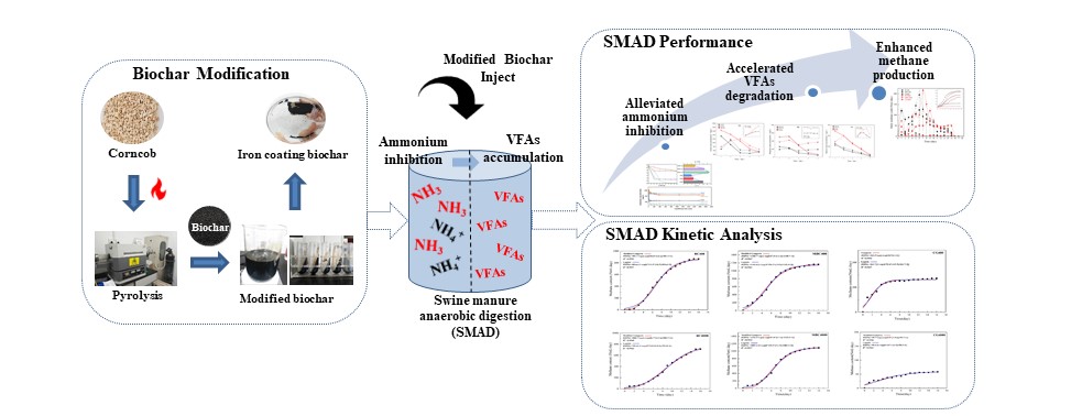 文章制备并应用铁改性生物炭用于提升高氨氮负荷厌氧消化(SMAD)中甲烷产率,并采用动力学模型对甲烷产量进行准确预测。铁改性生物炭添加能够有效打破从丁酸盐到乙酸盐的热力学屏障,并加速丙酸盐的降解,当氨氮负荷从400 mg/L升至4000 mg/L时,产甲烷效率仅由94.3%降至94.0%。动力学分析表明采用Logistic 模型较Modified Gompertz模型而言更加精准地描述 SMAD 实际甲烷产量。本研究为铁改性生物炭集约化生产及其在SMAD中的大规模应用提供了基础理论数据和重要动力学参数。