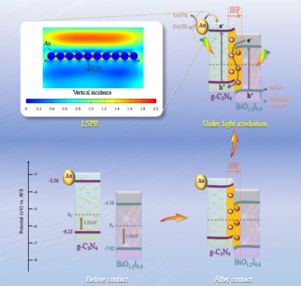 通过煅烧g-C3N4纳米片和花状BiOI的混合物,构建了g-C3N4/BiO1.2I0.6及Au/g-C3N4/BiO1.2I0.6异质结光催化剂。在可见光照射下,g-C3N4/BiO1.2I0.6和Au/g-C3N4/BiO1.2I0.6异质结表现出优异的光催化活性,并且具有高循环稳定性。电荷分离效率高、Au沉积引起的局部表面等离子体共振(LSPR)的优异光吸收以及S型异质结的是其具有高光催化活性原因。