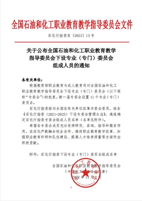 近日,全国石油和化工职业教育教学指导委员会下发《关于公布全国石油和化工职业教育教学指导委员会下设专业(专门)委员会组成人员的通知》,77779193永利官网李梅生、吴飞跃两位老师当选石化行指委专委会委员。