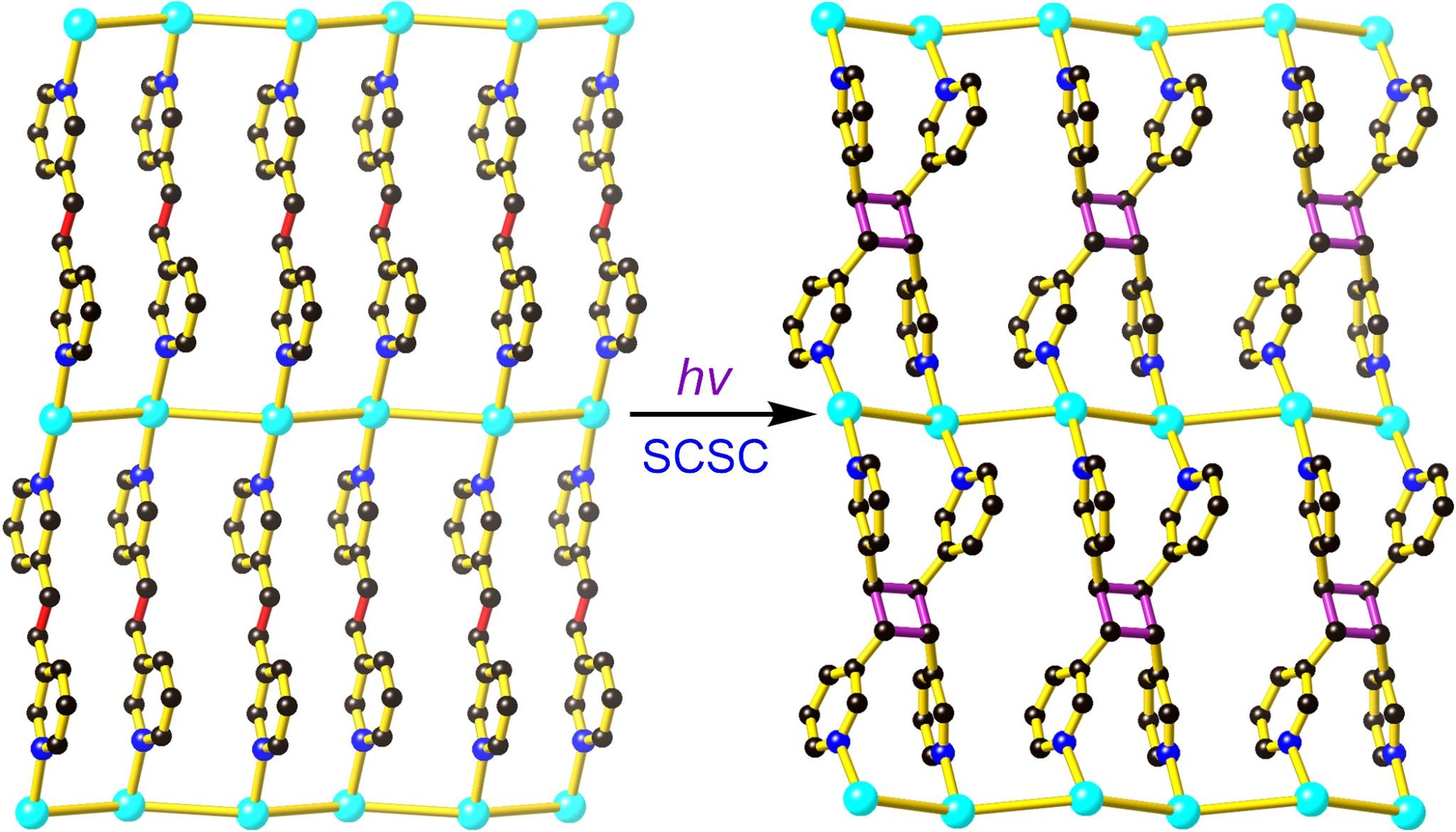 作为合成化学和材料科学中的一类重要化学反应,基于烯烃配合物的固态[2+2]光环加成反应近年来引起了人们的广泛关注。这类反应不仅可以高效高选择性合成出传统溶液反应很难甚至无法制备的环丁烷衍生物,还能用来开发光控智能材料和分子/超分子器件。本论文通过硝酸锌与邻苯二甲酸以及1,2-双(3-吡啶基)乙烯配体自组装,制备了一种二维(4,4)网格状光敏配位聚合物。在紫外光的催化下,该配位聚合物通过单晶到单晶转变的形式发生[2+2]光环加成反应,形成二维双节点配位聚合物。由于配体共轭性的改变,配位聚合物的荧光强度发生显著改变,使其在光信息储存及光学防伪等领域具备潜在应用价值。