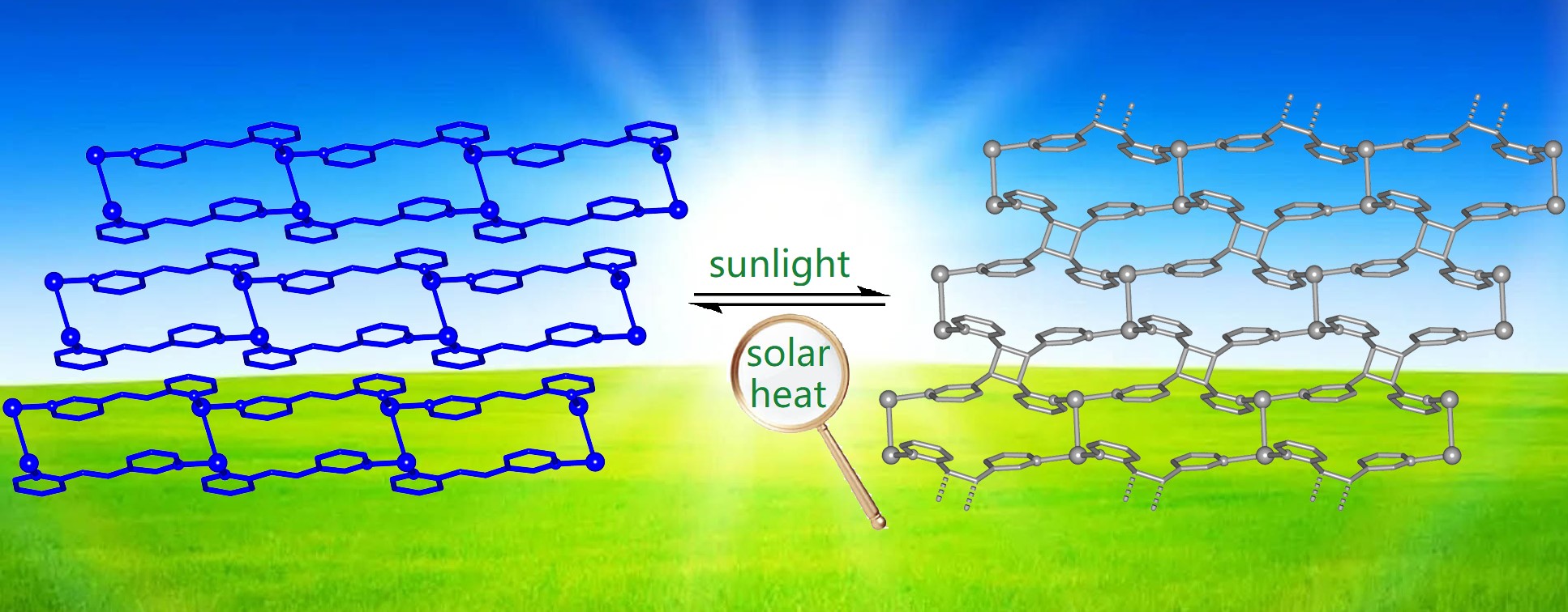 晶态物质中的可逆共价反应是设计和制备新一代智能材料的有效工具,人们可基于该类反应创造超分子开关和器件。由于不需要昂贵的设备和大量的能耗,太阳光诱发的共价反应展现了更高的研究价值。本论文通过银盐与间苯二甲酸以及1-(2-吡啶基)-2-(3-吡啶基)乙烯配体自组装,制备了一种具有超强光敏活性的晶态配位聚合物。该配位聚合物在太阳光的照射下可发生[2+2]光环加成反应,形成另一种配位聚合物。通过利用太阳光的热效应,配位聚合物可逆恢复至初始状态。配位聚合物在两种状态下的光致发光性能展现巨大差异,是潜在的光信息储存材料及防伪材料。