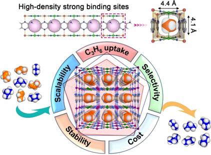 开发同时具有优异分离性能、高稳定性和易于合成三者相结合的用于丙烯/丙烷分离的多孔材料面临着重大挑战。此工作采用氨基吡嗪、二价镍和二价钴等组装得到了一种稳定的霍夫曼构型的配位聚合物材料(ZJU-75a),该材料具有高密度的强结合位点,可同时具备上述三个特点。ZJU-75a具有大的丙烯吸附量,其存储密度达到破纪录的0.818g·mL-1,同时在296K1bar下还表现出很高的丙烯/丙烷选择性(54.2)。单晶结构分析表明,ZJU-75a中高密度的氨基结合位点不仅提供了很强的丙烯相互作用,而且可使丙烯在材料孔道中高密度堆积。在丙烯/丙烷混合气体的穿透实验中也同时表现出高的分离因子(14.7)和丙烯高吸附量(2.79mmol·g-1)。此外,该材料稳定性高,可通过绿色合成方法实现在公斤级规模下简便生产,有望成为解决工业丙烯/丙烷分离这一重大挑战的潜力材料。