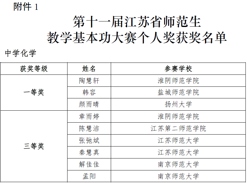 据悉,全国师范院校师范生教学技能竞赛由浙江师范大学主办、全国地方高等师范院校教务处长联席会议指导,以“学生以赛促学,教师以赛促教”为抓手,交流师范生培养经验,促进师范生教学能力提升;长三角师范生教学基本功大赛由长三角地区三省一市联合举办,旨在以教育信息化带动教育现代化,培养一批具备STEM教学设计理念和创新教学实践能力,适应“互联网+教育”的高素质专业化教师队伍;江苏省师范生教学基本功大赛由江苏省教育厅主办,是我省级别最高、规模最大、内容最全的师范生教学基本功大赛。