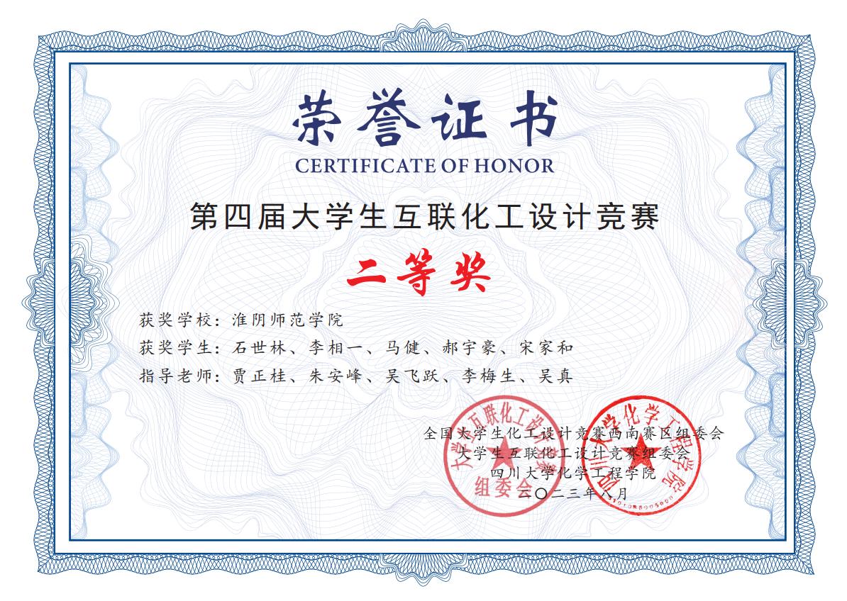 近日,第四届大学生互联化工设计竞赛在四川大学成功举行,77779193永利官网化工系西街独立小分队(队员:石世林,李相一,马健,郝宇豪,宋家和)参赛作品荣获二等奖。