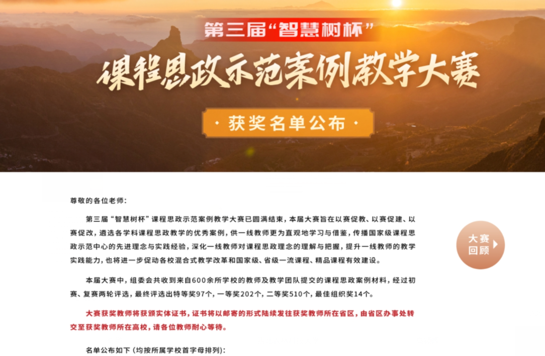 第三届“智慧树杯”课程思政示范案例教学大赛是由华东师范大学等六所国家级课程思政教学研究中心与智慧树网联合举办的盛会。大赛旨在深入践行习近平总书记关于教育的重要论述,积极贯彻教育部发布的《高等学校课程思政建设指导纲要》文件精神,面向各级各类高校中积极从事在线教学和线上线下混合式教学的专职教师,紧密围绕教师队伍、课程建设和课堂教学三大核心领域,推动学校教师承担育人责任,夯实教育渠道,发挥课程建设的主战场作用。