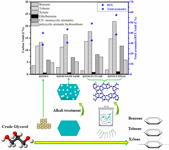 将可再生的粗甘油直接芳构化为基础化工原料BTX芳烃是一种替代传统化石燃料制备芳烃的潜在路径,同时对于实现我国碳中和战略和循环经济也具有重要的研究意义。研究团队分别以碱后处理法、软模板法、硬模板法,构建了不同形貌、孔道结构和酸性分布的多级孔HZSM-5分子筛,并研究所得分子筛催化粗甘油芳构化反应的构效关系。结果发现碱后处理法易导致HZSM-5骨架结构的不可逆破坏,同时得到的介孔尺寸不均匀,且处理后酸浓度增量较小。因此,该样品在催化粗甘油芳构化反应中芳烃收率增幅较小。此外,碱处理后的HZSM-5/0.3MNaOH的可重复使用性比模板化分层样品差,这是由于碱后处理法制备的多级孔HZSM-5的重复使用性远低于模板剂法,这是由于采用破坏性方法得到的介孔的不稳定。而软模板法(TPOAC为模板剂)建造的多级孔HZSM-5晶体尺寸更大,比表面积更高,L酸密度更大,且介孔均匀分布在3 ~ 4 nm范围内,因而得到更高的BTX和C9+单环芳烃的产率。硬模板法(CNT-OH为模板剂)构建的多级孔HZSM-5则晶体尺寸较小、B酸浓度高、且介孔均匀分布在10 ~ 20 nm范围内,这使得其在催化粗甘油芳构化过程中多环芳烃和焦炭的收率较高。
