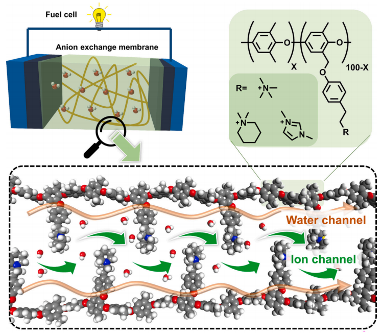 阴离子交换膜耐碱性差、离子电导率低是阻碍其商业化应用的关键问题。在此,淮阴师范学院先进膜材料与过程团队设计并合成了一系列无苄基侧链型聚苯醚(PPO)基AEMs。然后系统考察了季铵、咪唑、哌啶等不同阳离子官能团对膜性能的影响。引入含醚键的侧链来构建微相分离结构,增强了AEMs的电导率(80 ℃时64 mS⋅cm-1)。同时,不含苄基结构的侧链有效避免了PPO主链上吸电子基团的影响。此外,苯环的位阻效应可以进一步减轻OH-的侵袭,从而提高膜的耐碱性。分子动力学模拟表明,侧链结构中的醚键与水分子之间形成了发育良好的氢键网络,提高了膜的导电性。同时,制备的膜具有良好的吸水性和一定的尺寸稳定性。